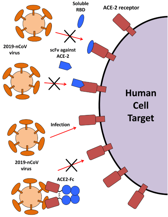对于抑制病毒进入细胞的策略来说,现阶段公认的较有潜力的靶点是新型冠状病毒的S蛋白和人体宿主身上的病毒受体ACE2(血管紧张素转换酶2)。S蛋白又被称为病毒刺突蛋白,而ACE2则是人体细胞上的一种酶,两者形成“锁与钥匙”的关系。目前已有研究表明新冠病毒可以利用S蛋白识别SARS冠状病毒的受体ACE2入侵人体细胞。因此阻断S蛋白和ACE2的结合理论上推测能够阻止病毒感染人体细胞。主要有三种方式:中和抗体结合病毒S蛋白、阻断屏蔽人体ACE2病毒受体;ACE2融合蛋白(ACE结合结构域与Fc片段融合提高半衰期)与病毒结合。