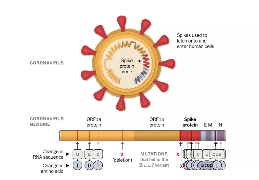 新型冠状病毒(B.1.1.7株)存在大量异常的遗传突变,尤其是在刺突 Spike蛋白(s蛋白)中。这些突变中N501Y突变是受体结合域(RBD)中的六个关键接触残基之一,该突变增加病毒对人和鼠血管紧张素转化酶ACE2的结合亲和力,进而增强病毒进入人体细胞的能力。据《科学》杂志报道,该变异病株的传播能力比原病毒高出70%左右。