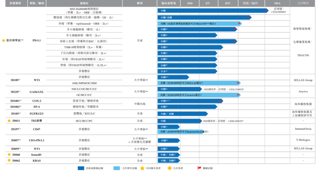围绕癌症治疗慢病化的趋势,公司已战略性地制定候选药物管线前瞻计划,并已在癌症治疗慢病化市场建立起领先地位,拥有包含12款候选药物的强大管线,包括充分验证的肿瘤免疫单药治疗、具有可与管线产品联用的作用机制的创新候选药物及疼痛管理资产。在候选药物中,有8款处于临床阶段,包括支柱产品恩沃利单抗,预期将于2021年底前获批并创收。该等临床阶段候选药物中有三款已进入II/III期关键性试验,这三款中的其中两款由合作伙伴进行。